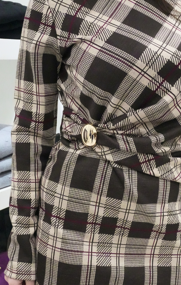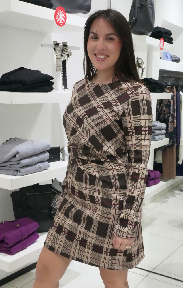 • motivo tartan nei toni del beige e marrone;