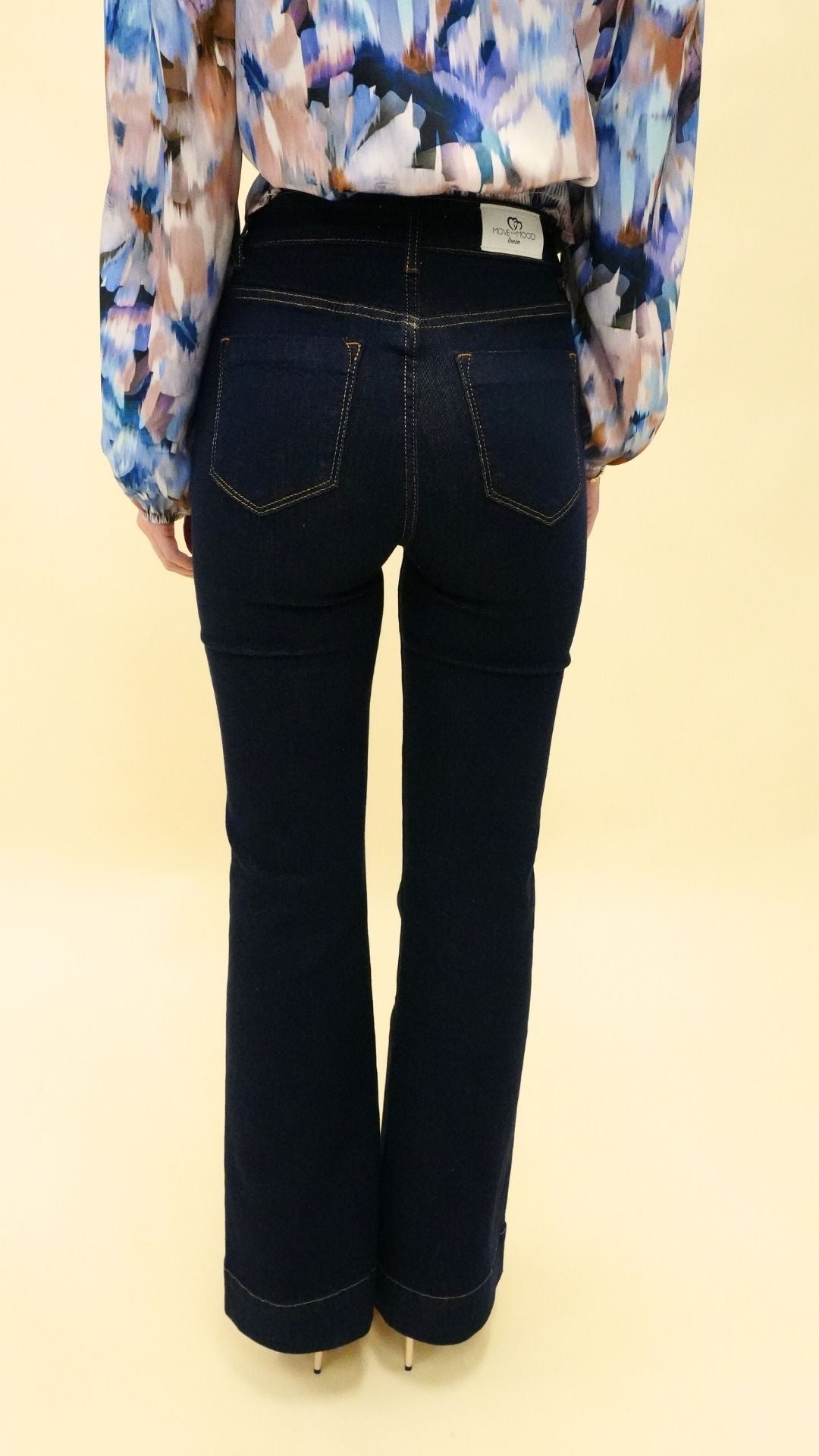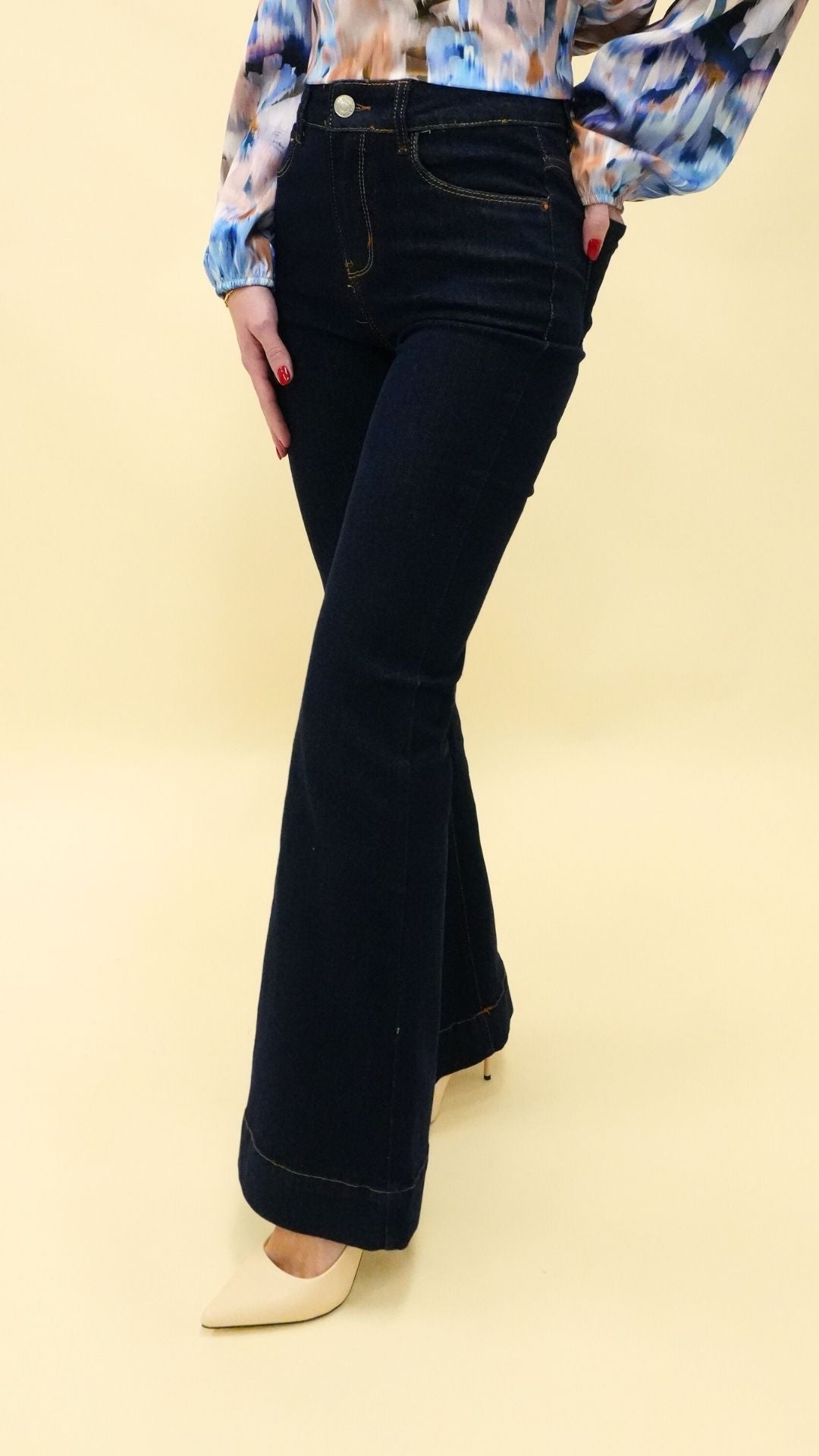 • vestibilità flare, aderente su fianchi e cosce, gamba svasata sul fondo;