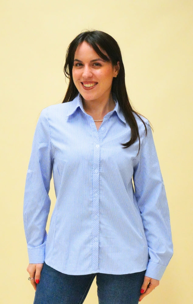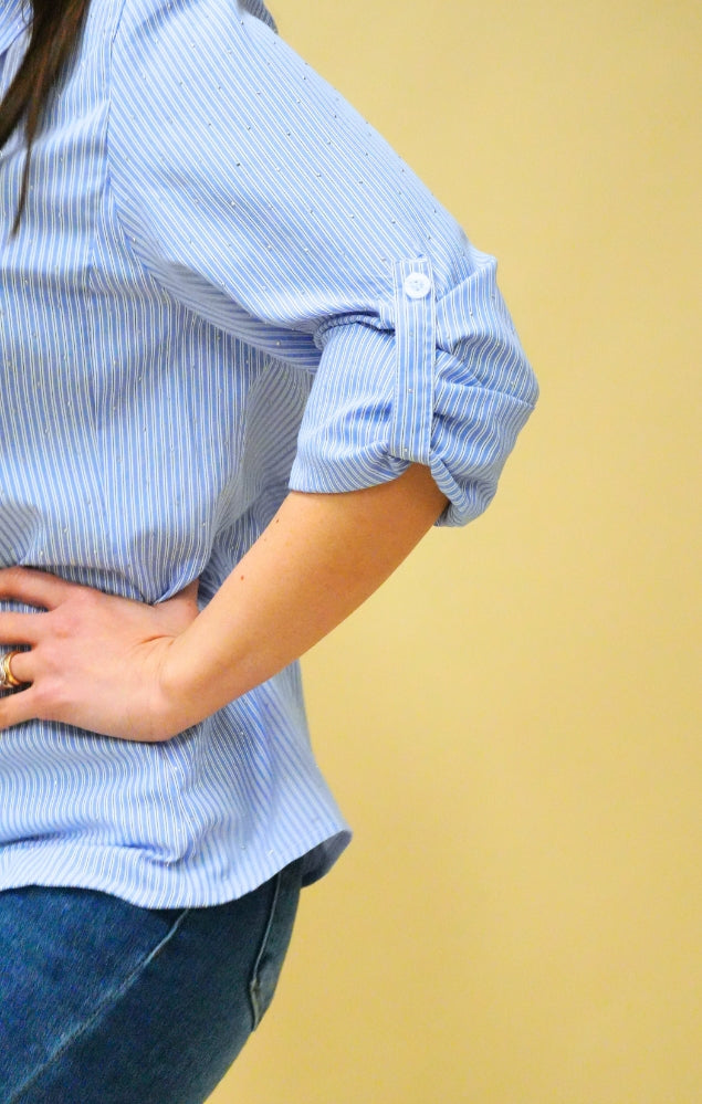 • Piccole applicazioni di strass distribuite su tutta la camicia