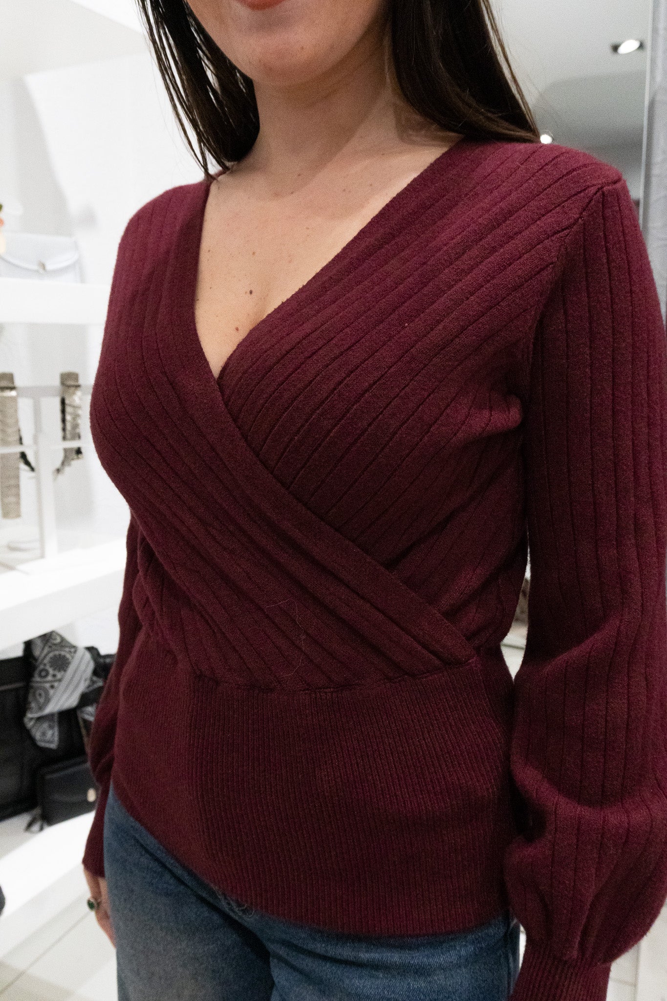 MAGLIA INCROCIATA A COSTE CON COLLO A "V" BORDEAUX