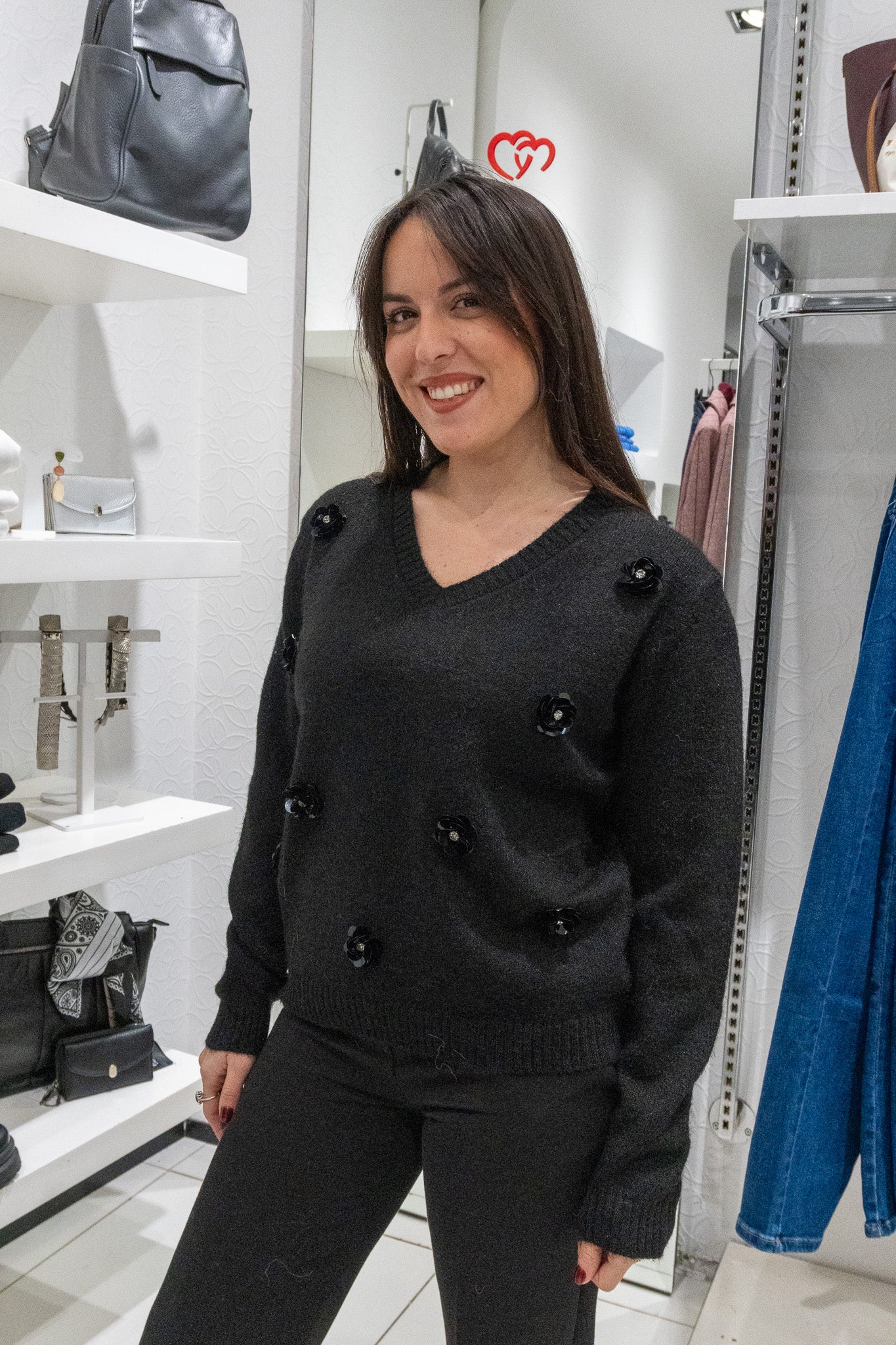 • applicazioni decorative in paillettes e brillantini color nero metallico, sul fronte;