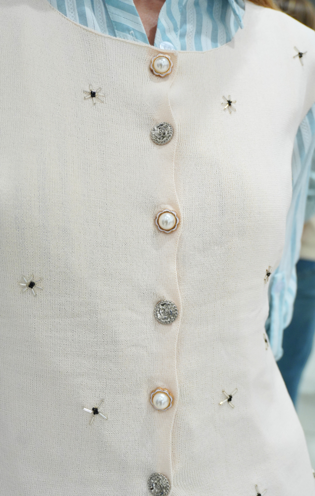 • Chiusura frontale con bottoni gioiello e perle decorative