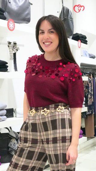 Maglia lana mezza manica con paillettes bordeaux
