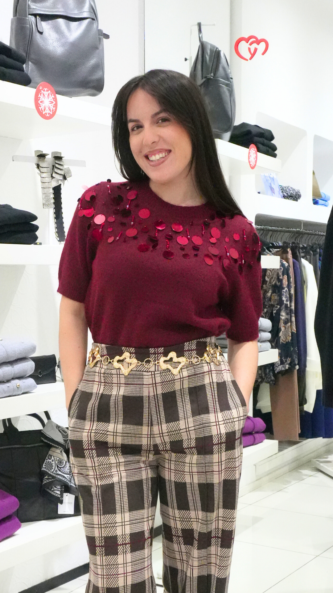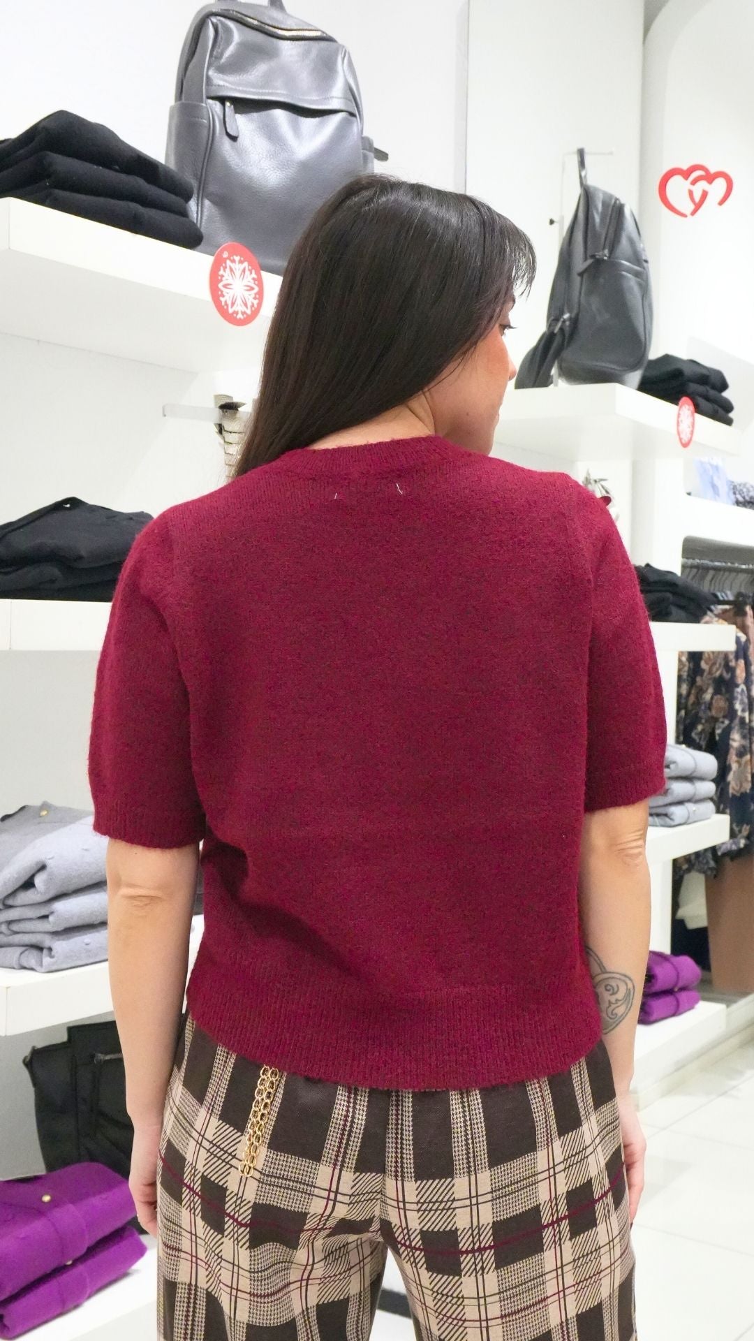 Maglia lana mezza manica con paillettes bordeaux