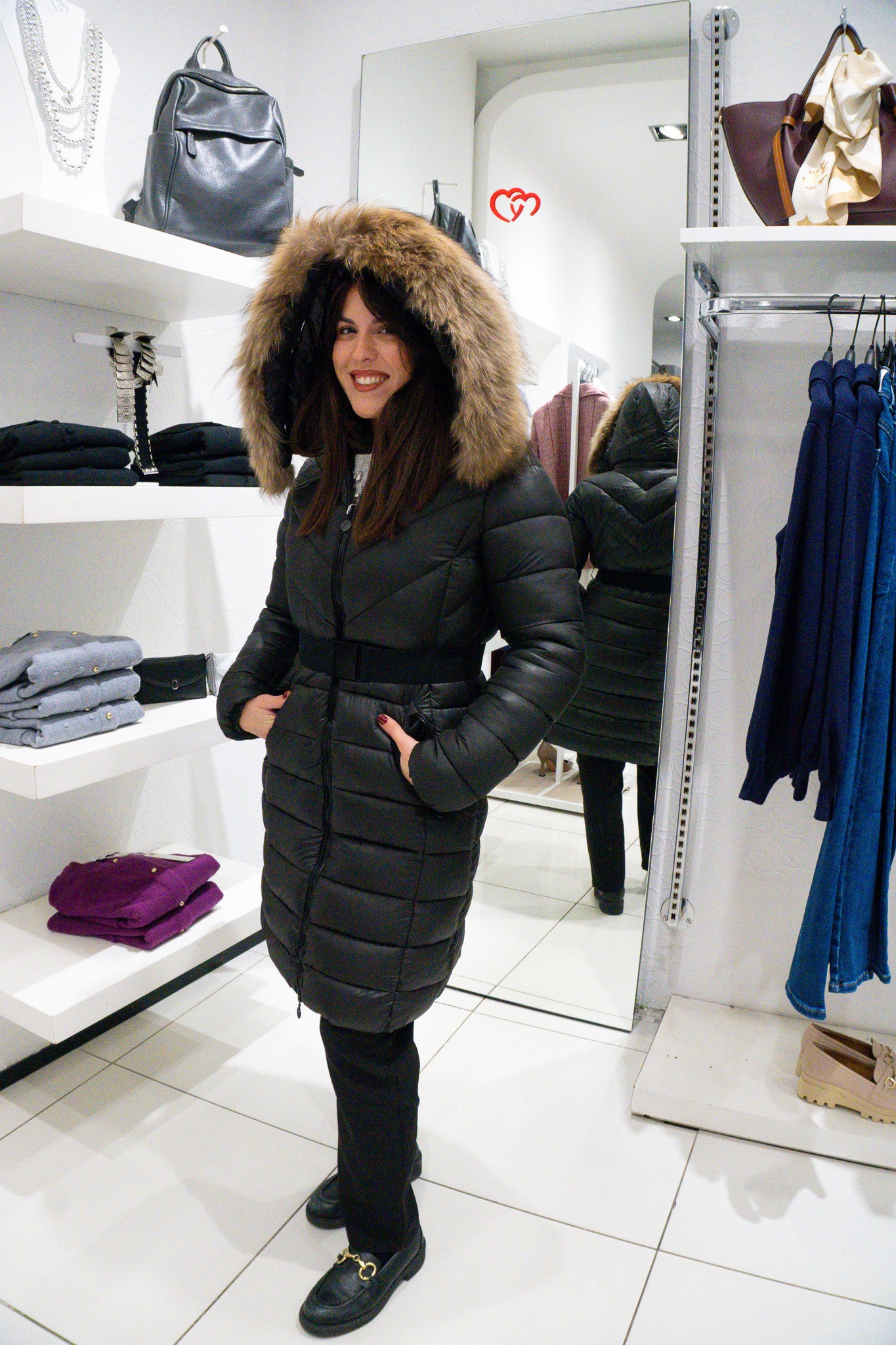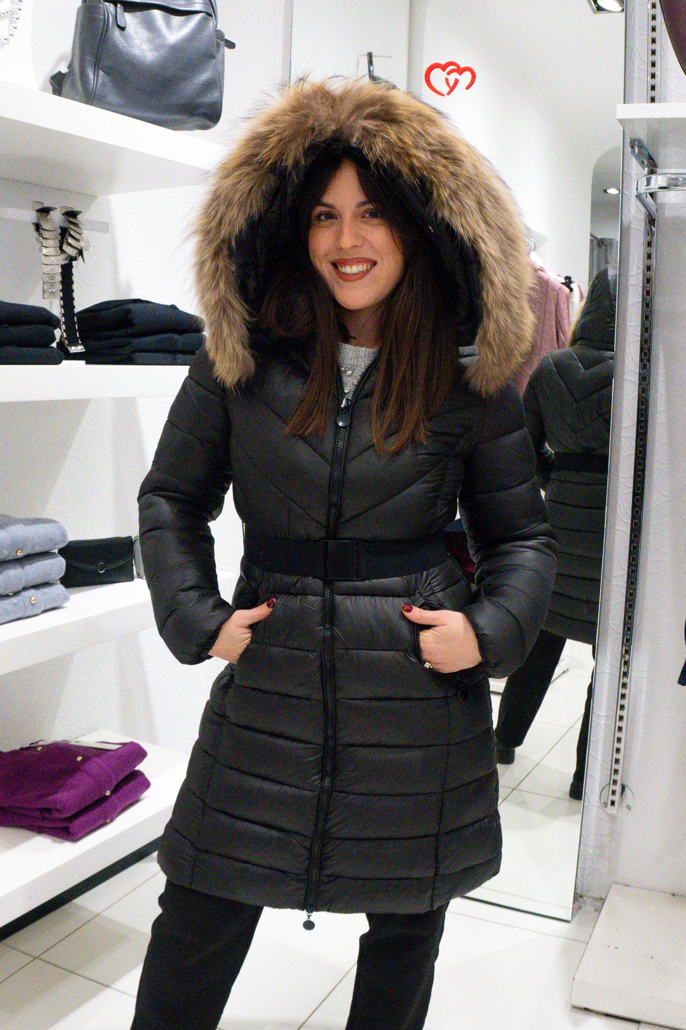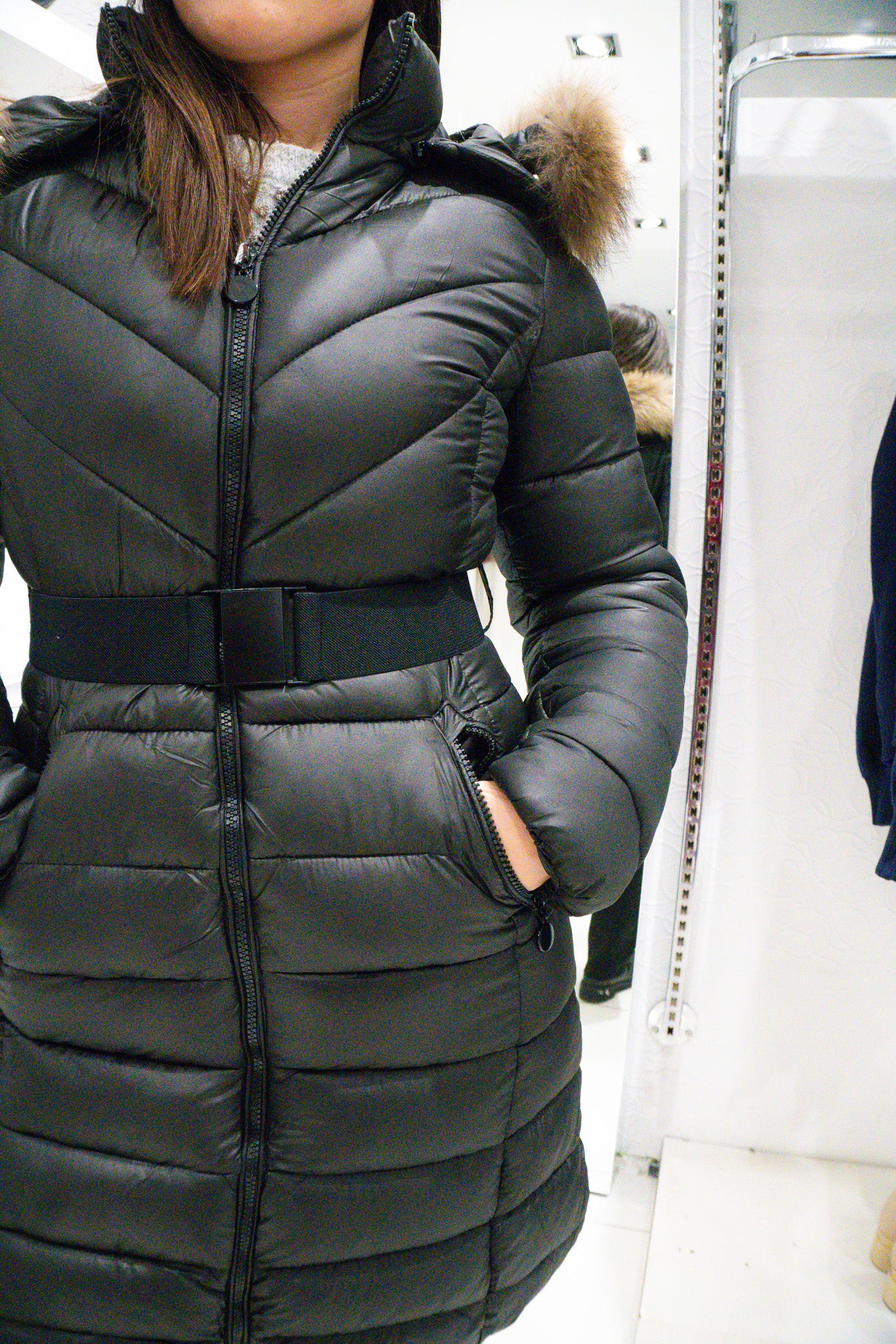 • cappuccio con bordo in pelliccia ecologica rimovibile tramite zip;