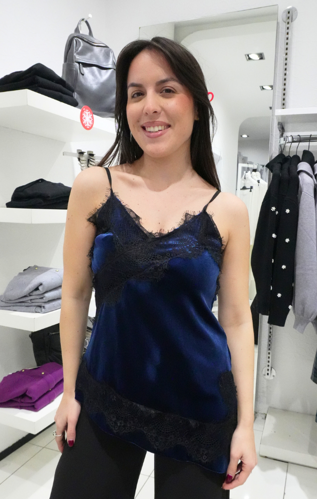 top in velluto con inserti in pizzo blu